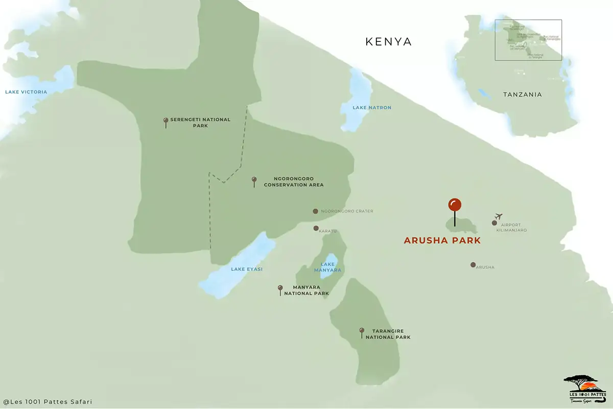 Arusha National Park, located just an hour’s drive from Arusha and covering an area of 137 km², is a must-see destination for lovers of nature and Tanzanian wildlife. The park is divided into three main areas: Mount Meru, Ngurdoto Crater and Momella Lakes.