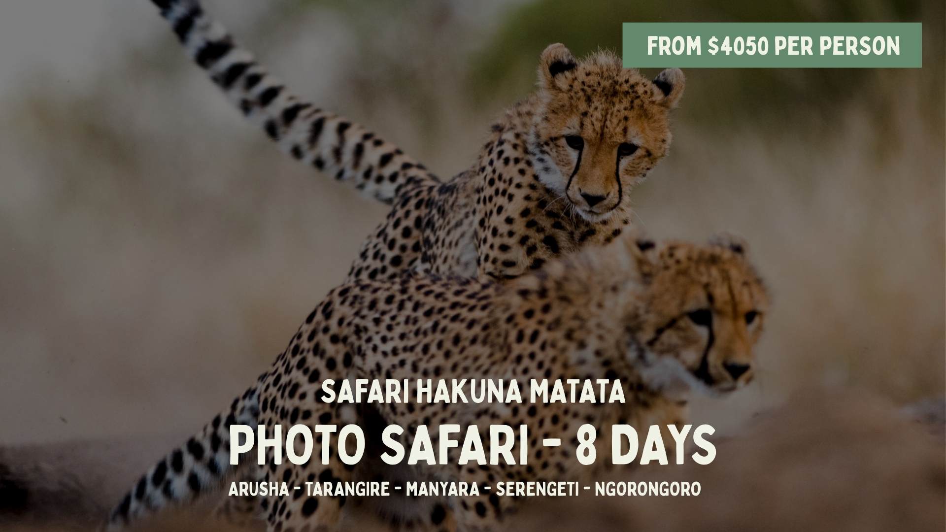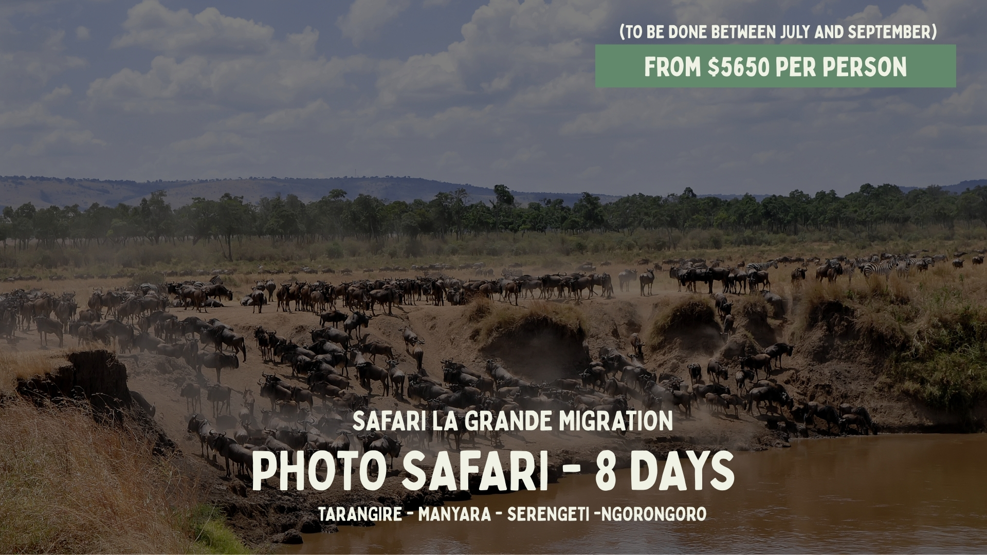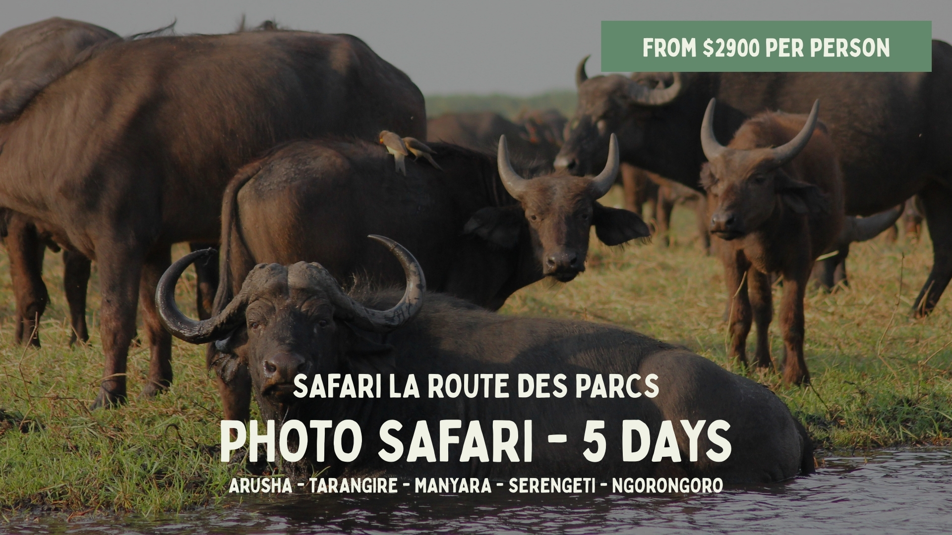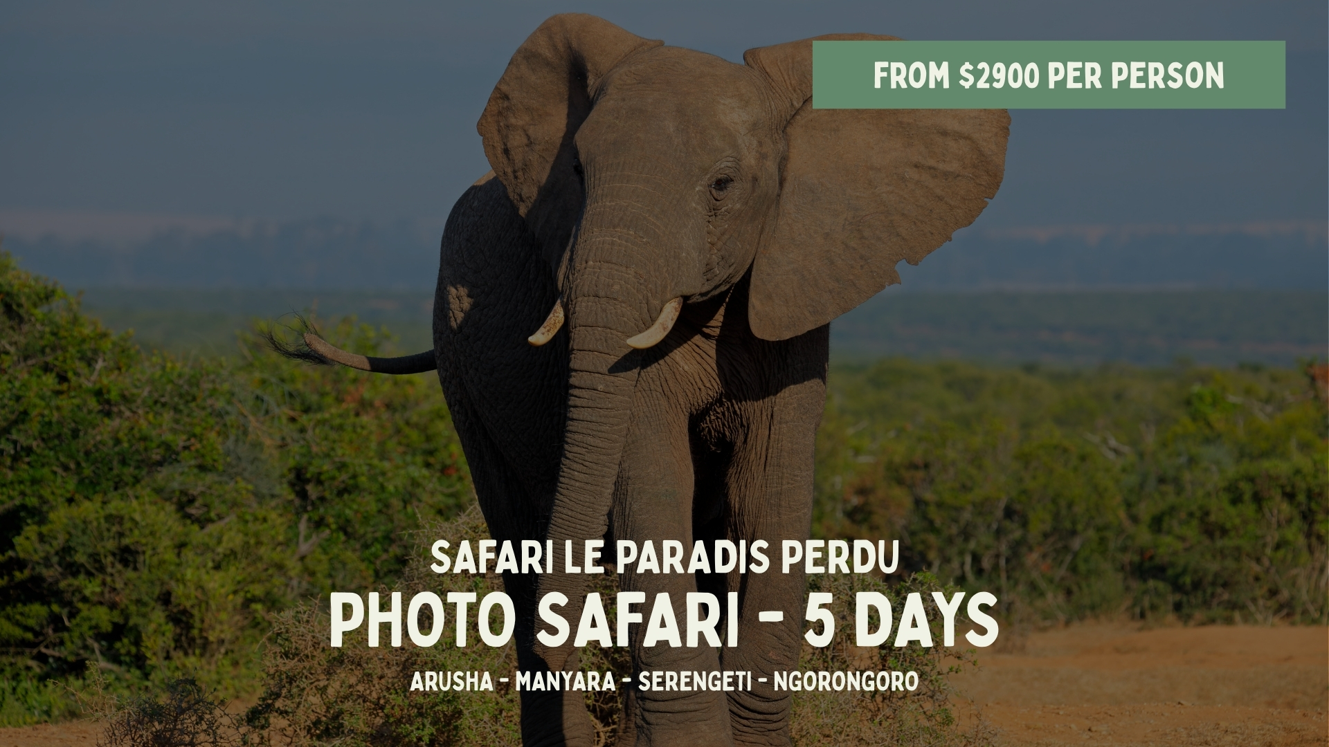 book your safariDiscover our safari tours in Tanzania, designed for an authentic and personalized experience. Each itinerary can be tailored to your preferences, with the accompaniment of local French-speaking guides, for a responsible and unforgettable safari. OUR SAFARI SELECTION LA ROUTE DES PARCS (from 2900$/pers)5 Days LE PARADIS PERDU (from 2900$/pers)5 Days THE BIG NINE (from 3600$/pers)7 Days HAKUNA MATATA (from 4050$/pers)8 Days LA GRANDE MIGRATION (From 5650$/pers)8 Days OUR SAFARI SELECTION