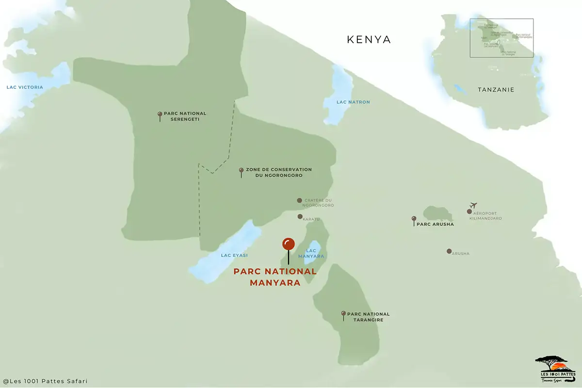 Idéalement situé, le parc se trouve à seulement 1 heure du parc national de Tarangire (70 km), à 2h30 d’Arusha (105 km) et constitue une étape incontournable sur la route des grands safaris du nord de la Tanzanie.
