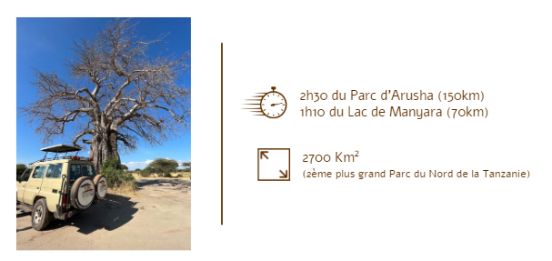 Au sein du Parc National de Tarangire découvrez les baobabs géants, appelés « arbres de vie », qui peuvent atteindre une hauteur de 30 mètres et un diamètre de tronc de 11 mètres. Ils ont la capacité de stocker jusqu’à 32 000 litres d’eau; ce qui s’avère très utile pour les éléphants et les populations locales pendant la saison sèche. Vous y trouverez le plus grand nombre d’éléphants au monde.